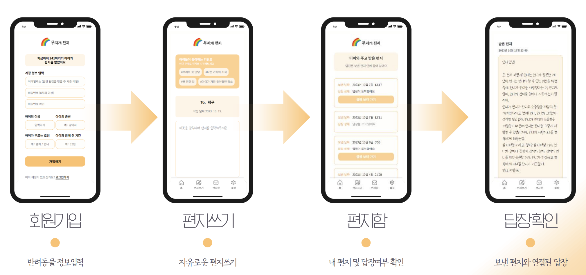 ‘무지개 편지’ 서비스란 펫로스 증후군을 겪는 사람을 위한 Chat GPT 기반 반려동물 편지 답장 서비스이고, 이를 통해 슬픔, 자책 등과 같은 감정을 표출하여 건강한 이별을 돕기 위해 만들어진 서비스이다. 유저들이 자신의 반려동물에게 편지를 쓰면, 운영자는 답장 프롬프트에 유저의 정보와 편지를 입력한다. 그 후 Chat GPT로 답장을 받아 워싱 작업을 거쳐 유저들의 편지함을 통해 답장을 전달한다. 유저들은 답장 알림을 메일과 문자로 받을 수 있으며, 답장의 공유하기 버튼을 통해 지인들과 답장을 공유할 수 있다.